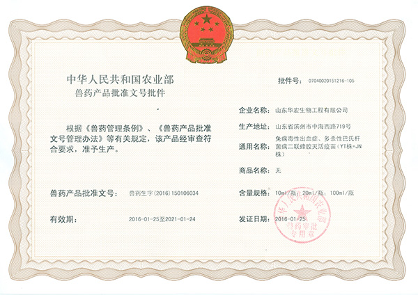 近 日,华宏生物生产的兔病毒性出血症、多杀性巴氏杆菌二联蜂胶灭活疫苗(YT株+JN株),通过了农业部的审查并获得了兽药产品批准文号(兽药生字(2016)150106034),有效期从2016年1月25日至2021年1月24日,符合《兽药管理条例》、《兽药产品批准文号管理办法》等有关规定,已具备生产条件,即可销售。