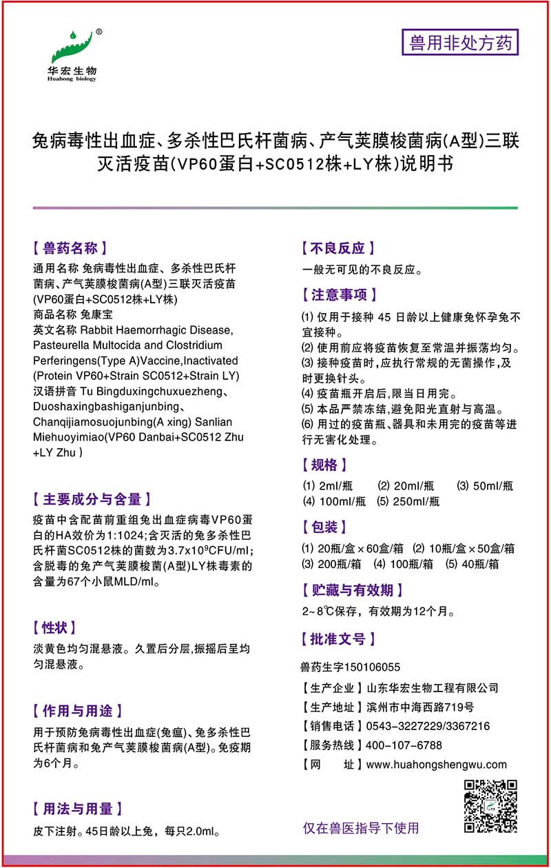 兔病毒性出血症、多杀性巴氏杆菌病、产气荚膜梭菌病(A型)三联灭活疫苗